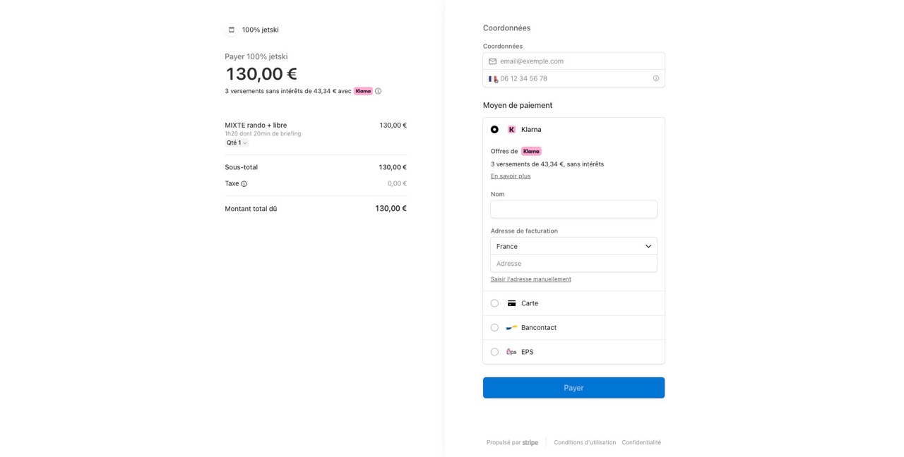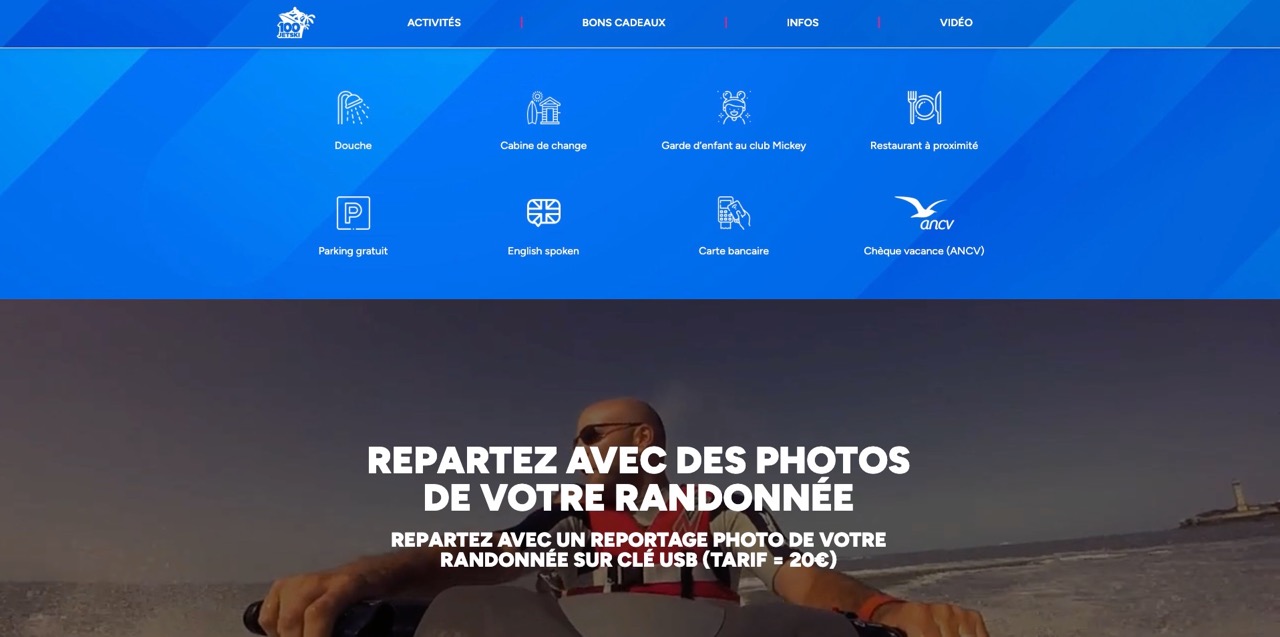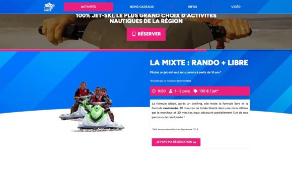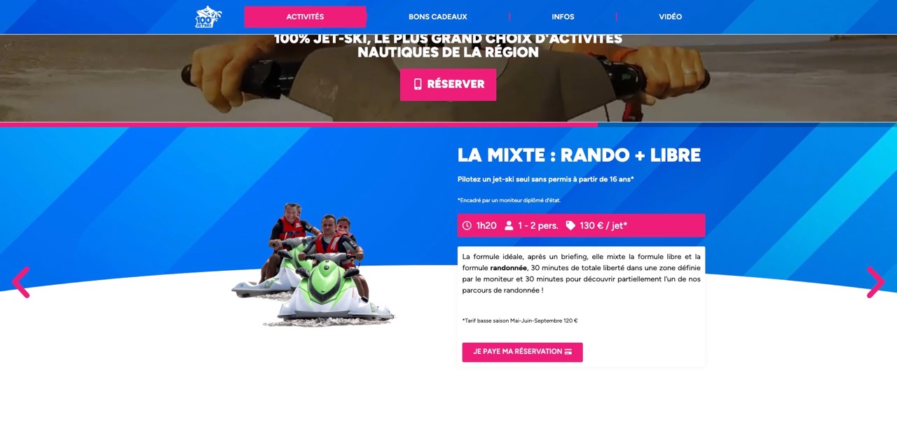 Refonte express du site Web 100% Jet-Ski pour le rendre « full responsive » et ajouter un moyen de paiement pour les Bons Cadeaux et la Réservation en ligne de créneaux.