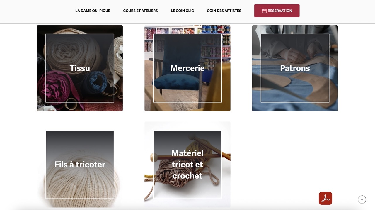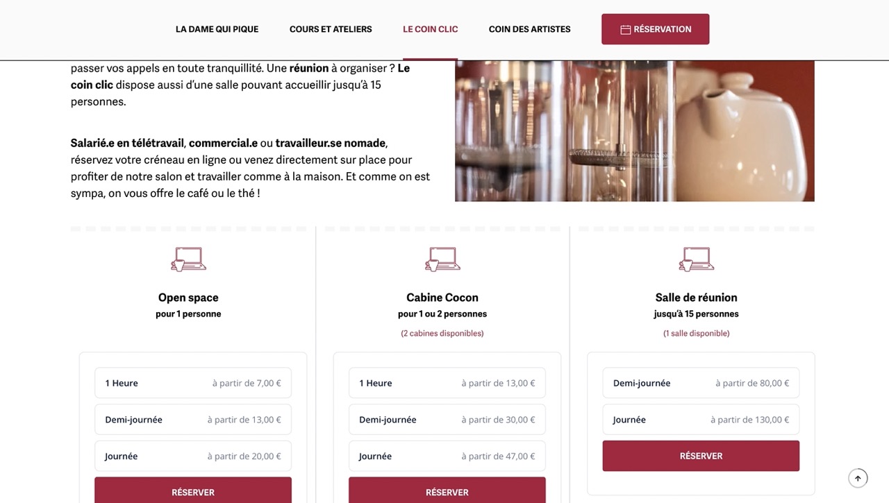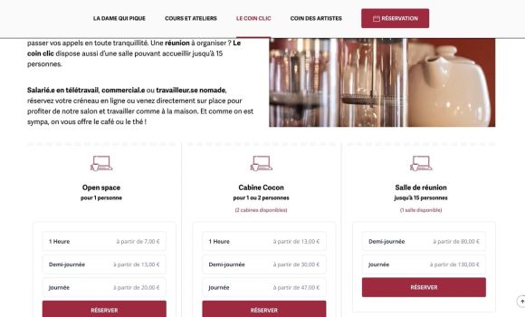 Création d’un site Internet vitrine pour les prestations du lieu (mercerie – espace de coworking – galerie d’art) avec système de réservation en ligne.