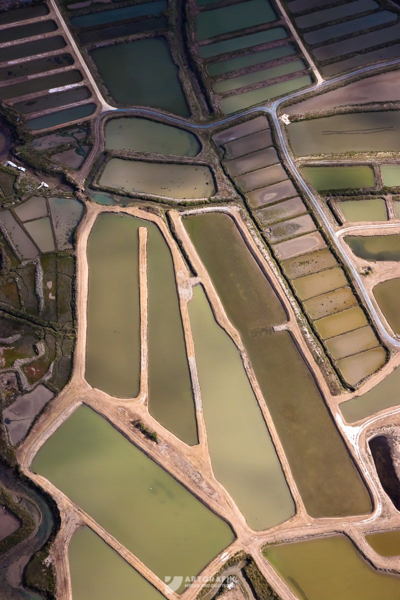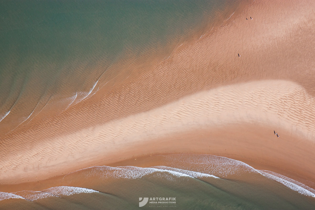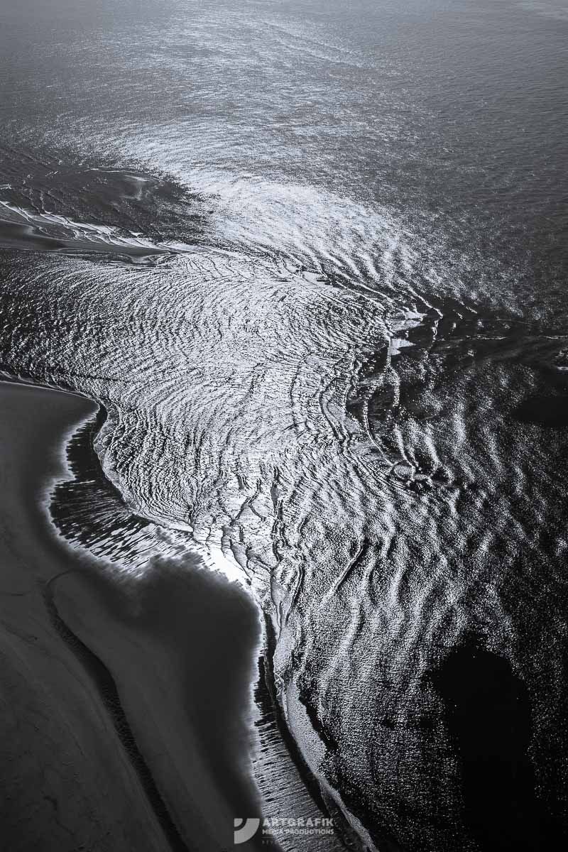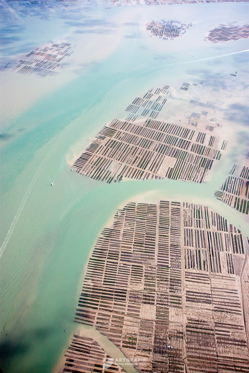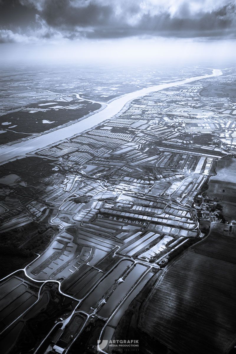 Les prises de vues ont été réalisées à bord d’un ULM afin d’avoir une altitude supérieure à celle permise pour le vol en drone. Nous avons pu ainsi réaliser des clichés avec de magnifiques panoramas. Mais aussi de splendides photos de bancs de sable ou de claires ostréicoles aux formes abstraites et poétiques.