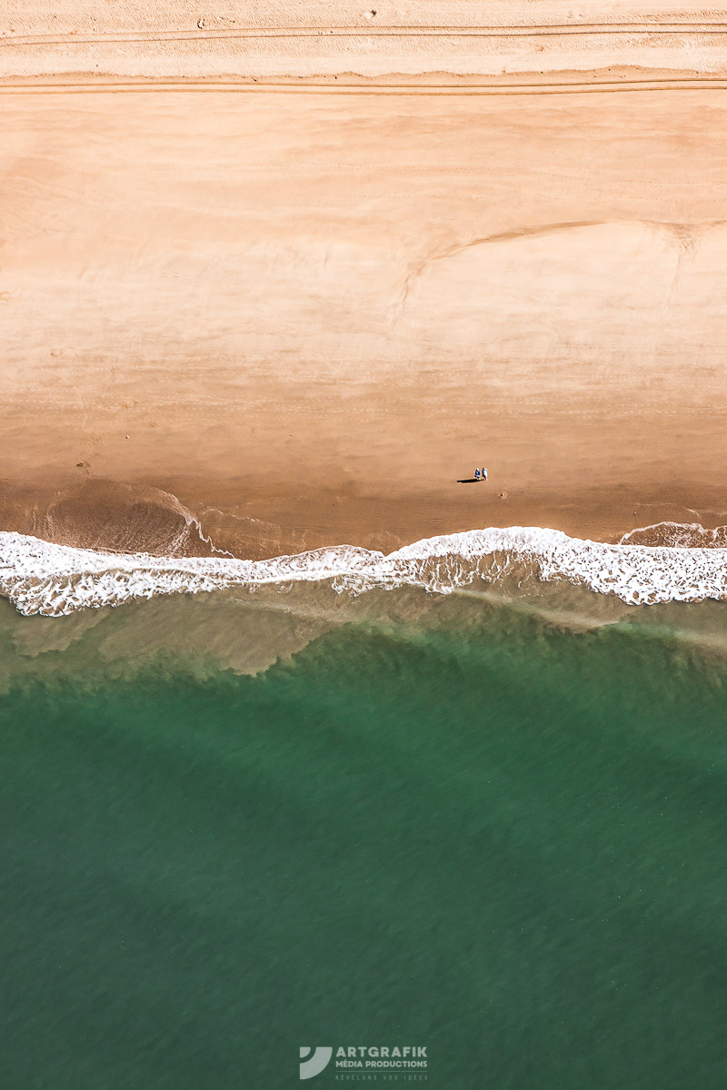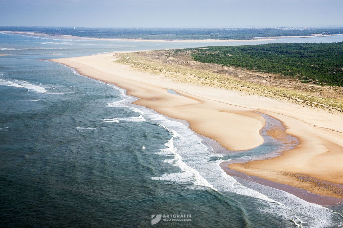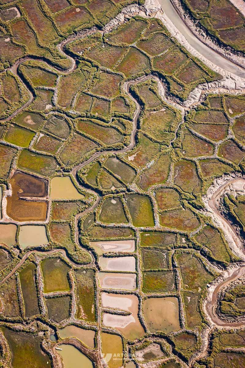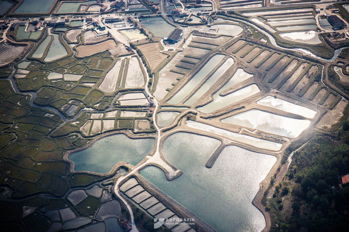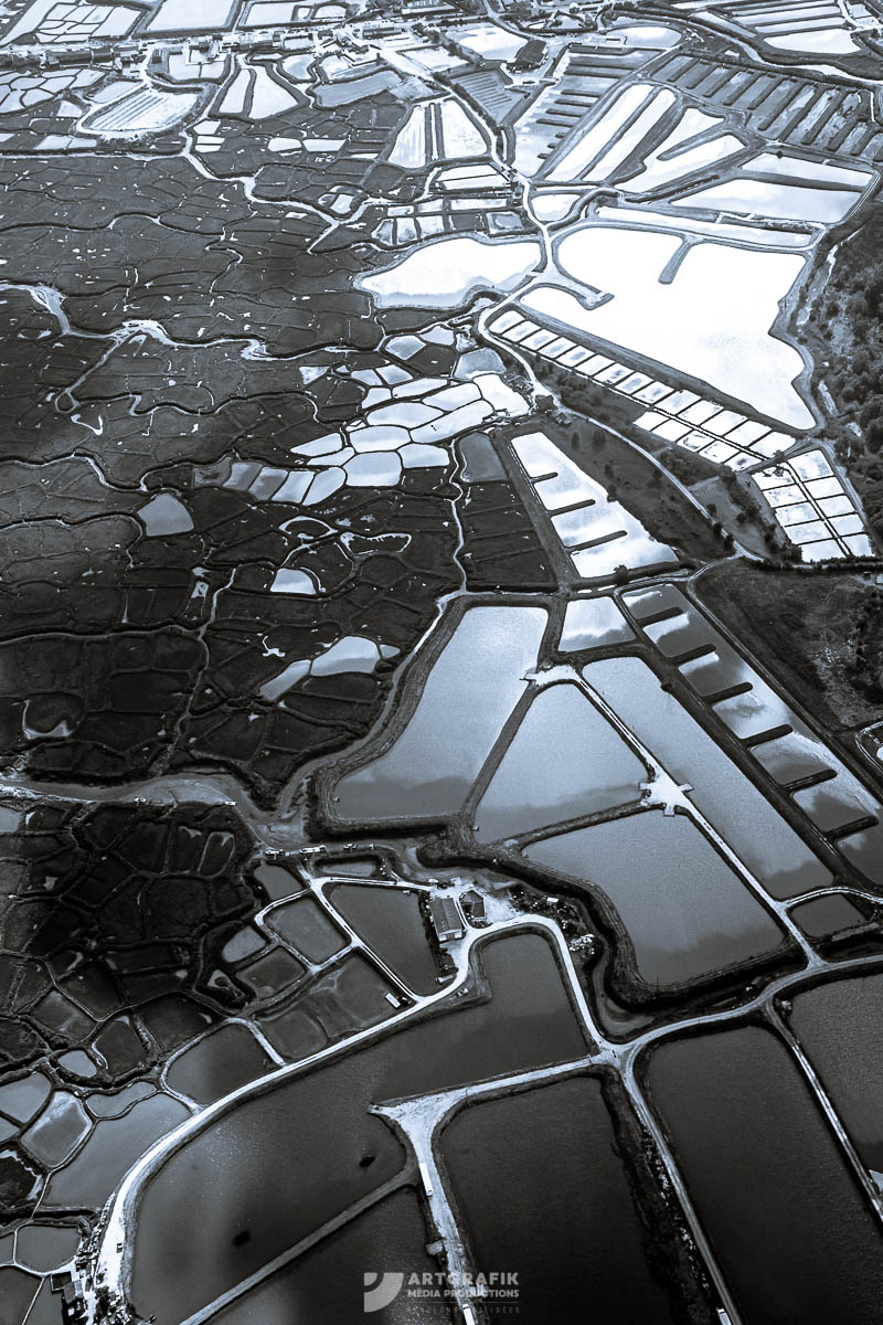 Les prises de vues ont été réalisées à bord d’un ULM afin d’avoir une altitude supérieure à celle permise pour le vol en drone. Nous avons pu ainsi réaliser des clichés avec de magnifiques panoramas. Mais aussi de splendides photos de bancs de sable ou de claires ostréicoles aux formes abstraites et poétiques.