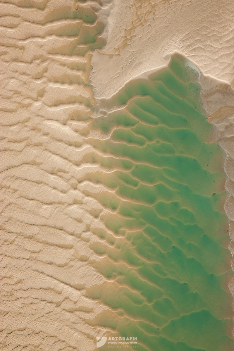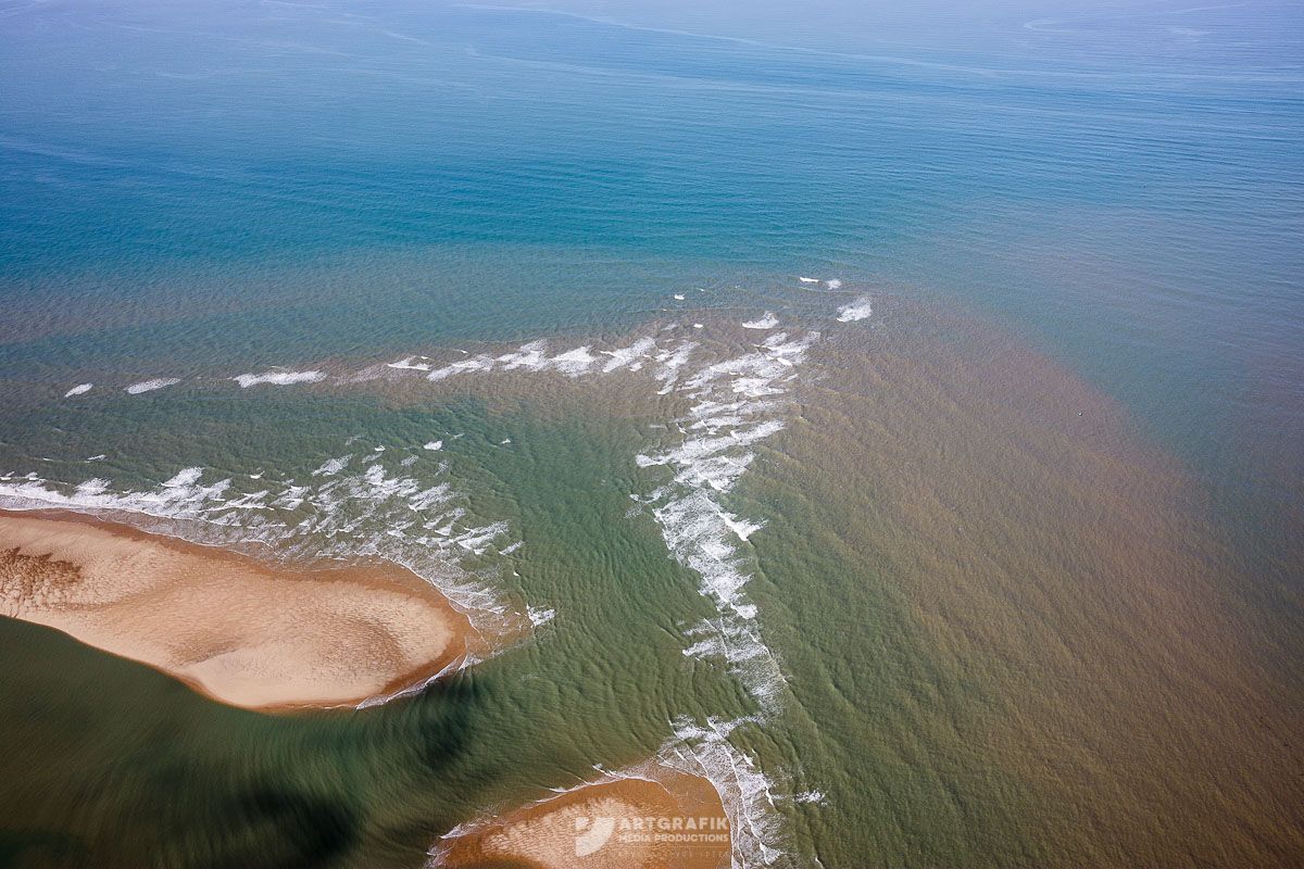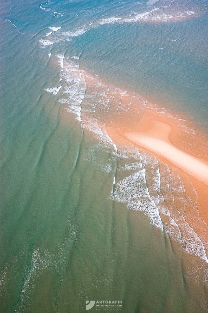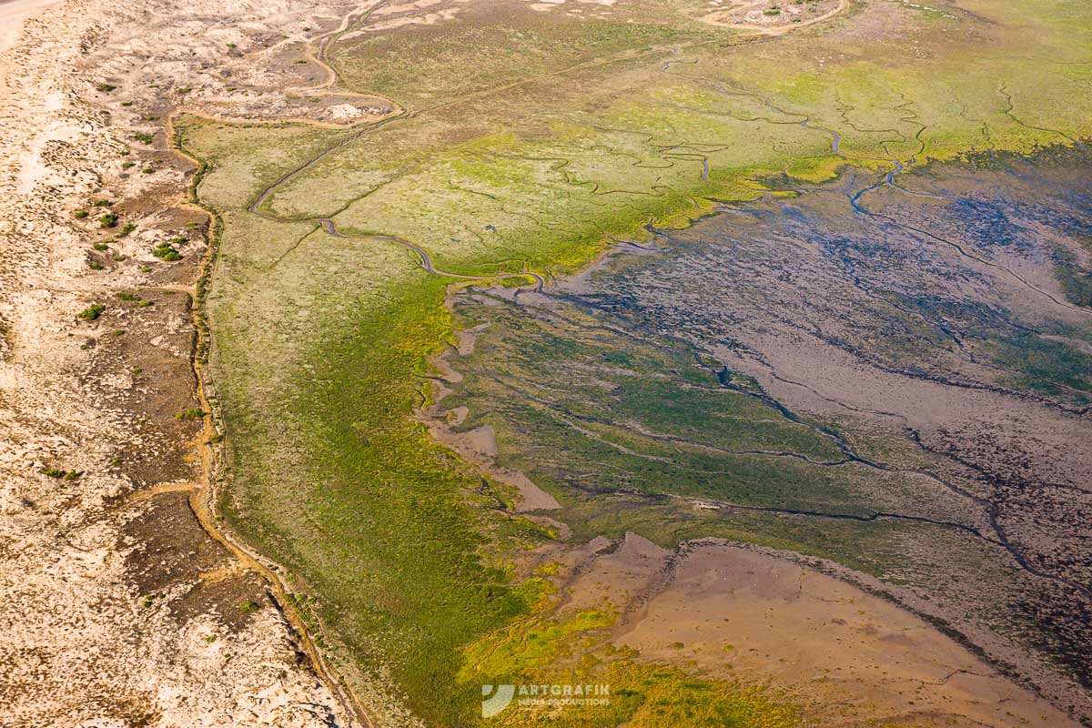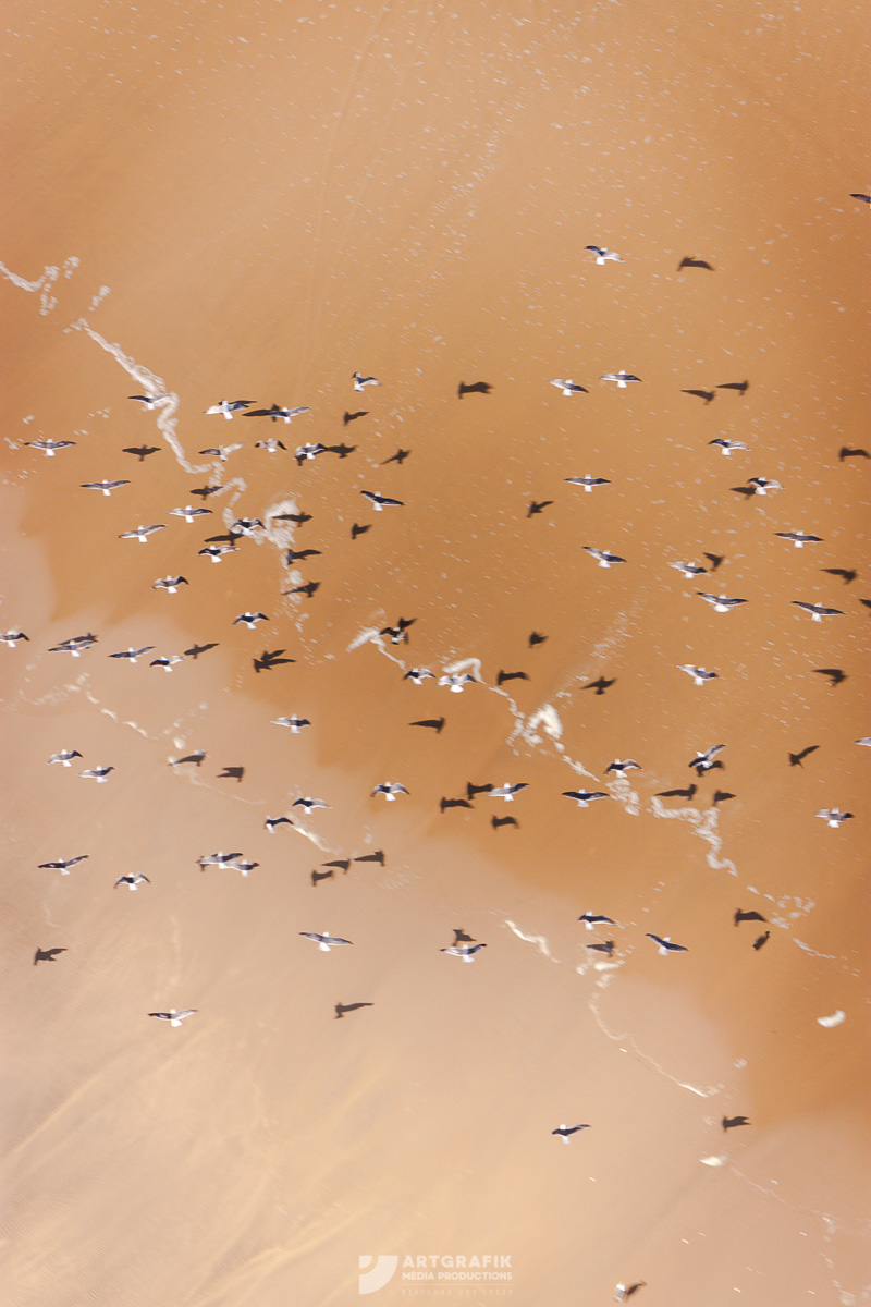 Les prises de vues ont été réalisées à bord d’un ULM afin d’avoir une altitude supérieure à celle permise pour le vol en drone. Nous avons pu ainsi réaliser des clichés avec de magnifiques panoramas. Mais aussi de splendides photos de bancs de sable ou de claires ostréicoles aux formes abstraites et poétiques.